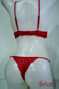 Conjunto de lingerie todo em renda composto por soutien sem bojo e calcinha fio com regulagem nas laterais.